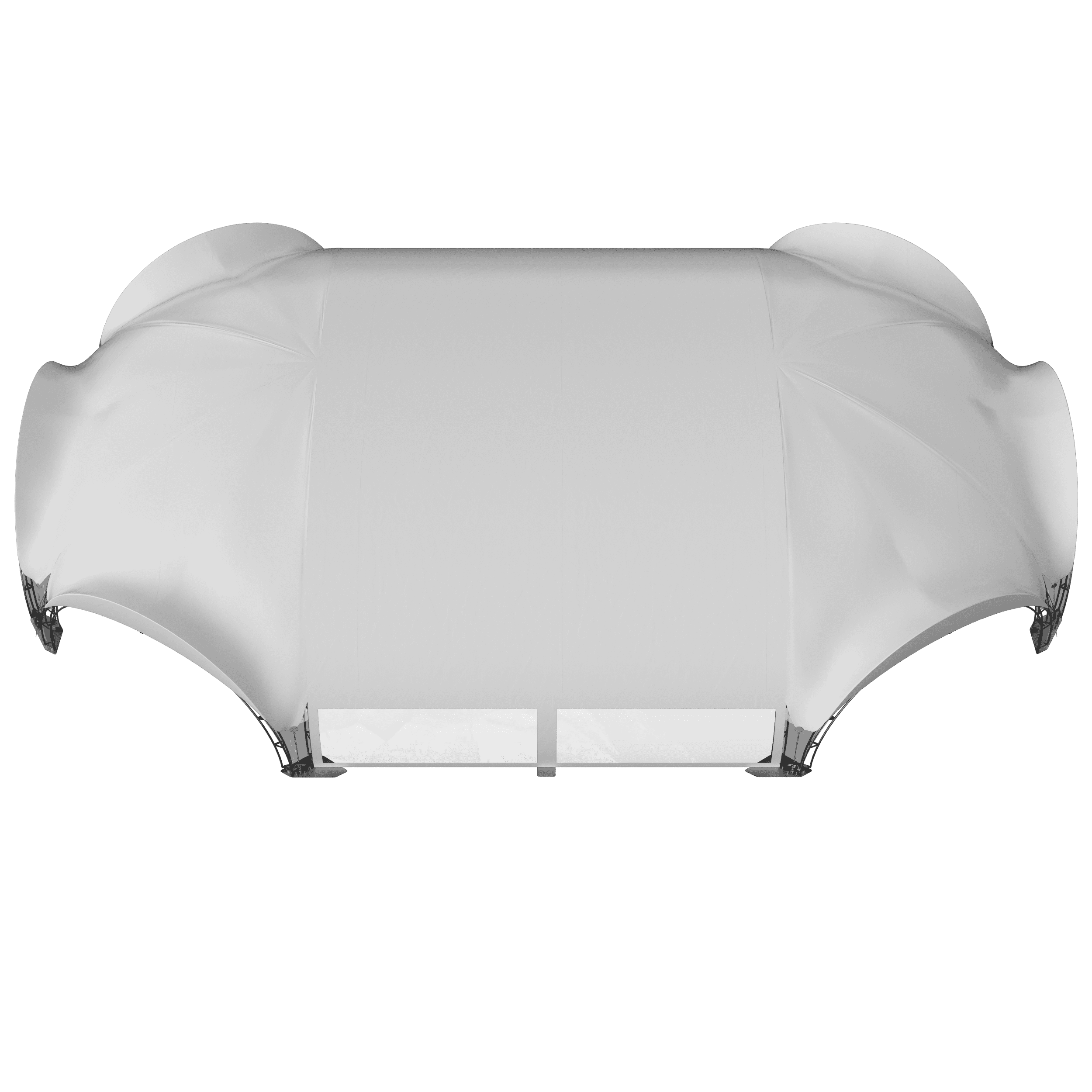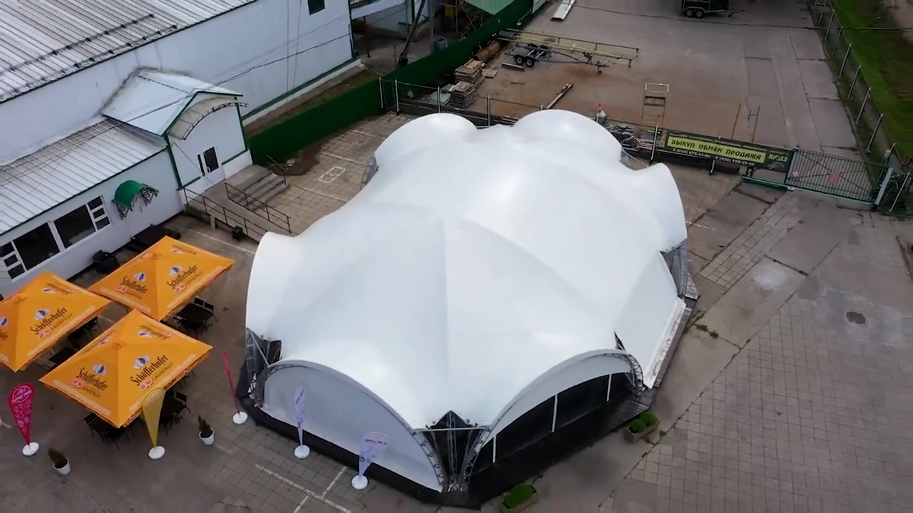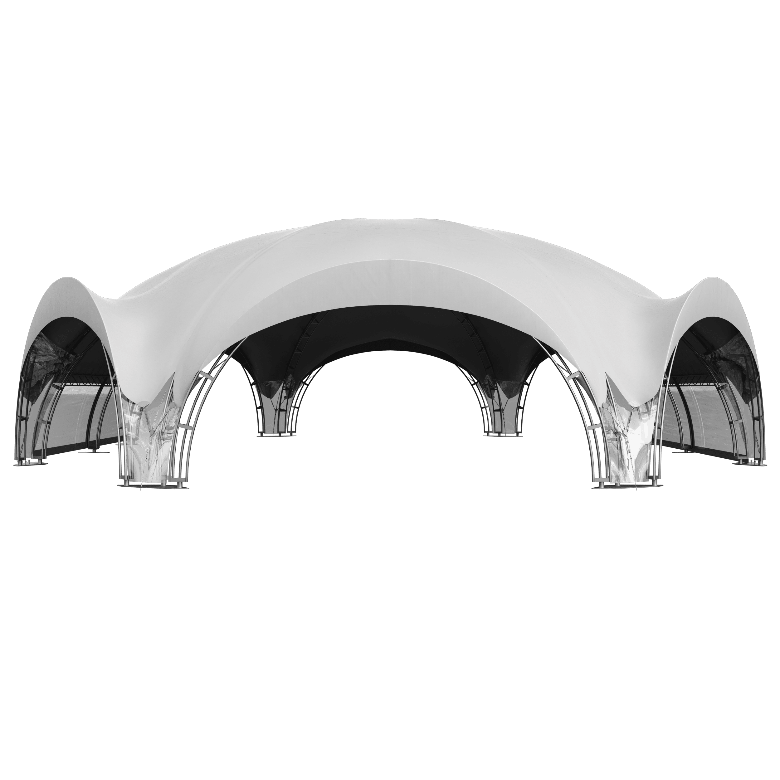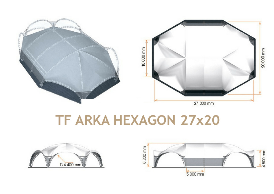 Конструкция TF arka Hexagon 27×20 имеет площадь 460м2. Форма шатра в основании – шестиугольник. Вместимость до 230 человек (банкетной рассадки).