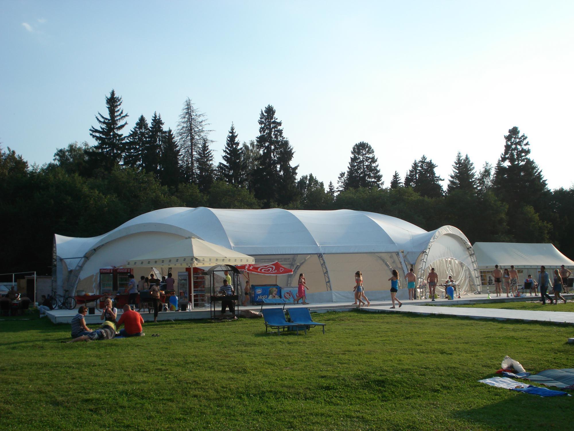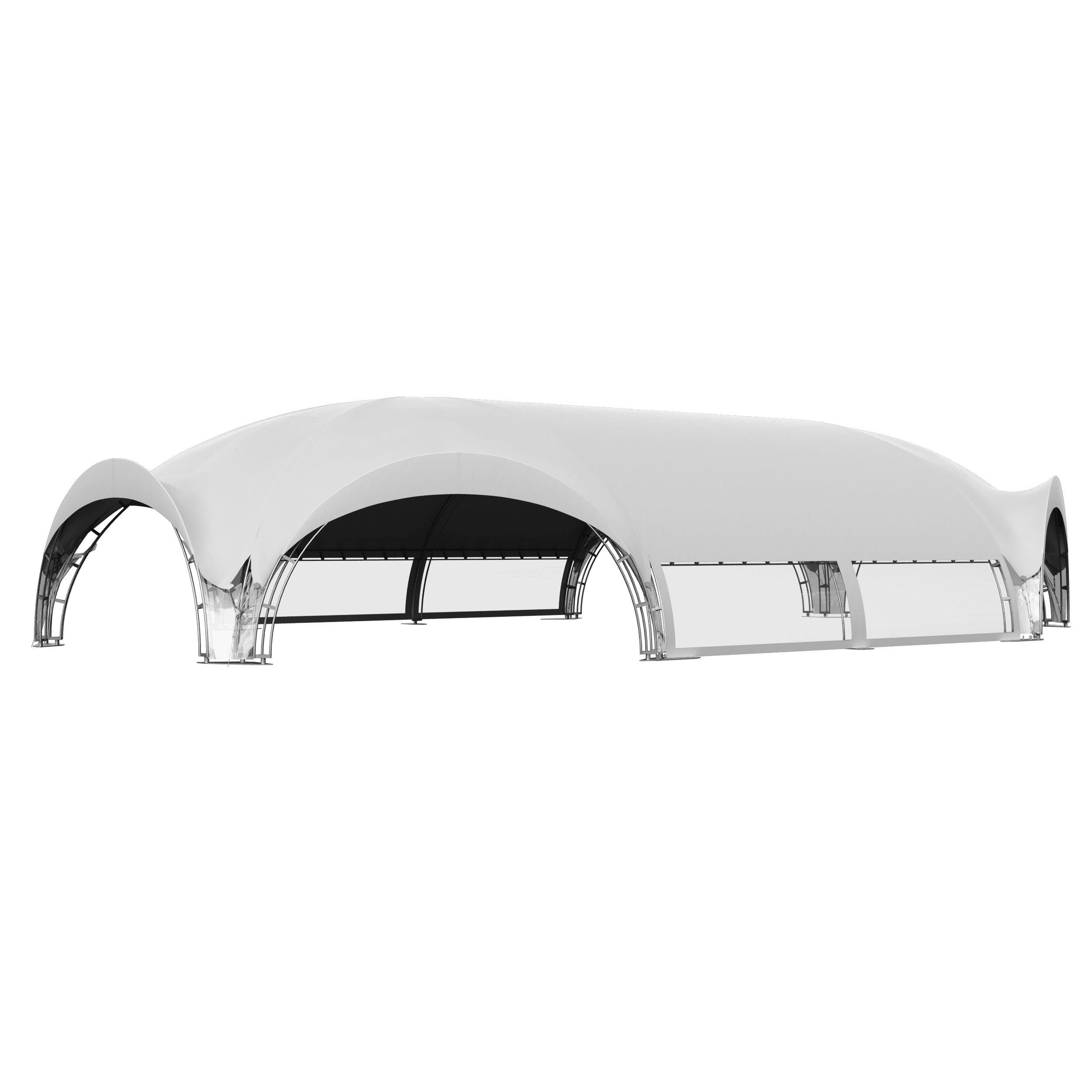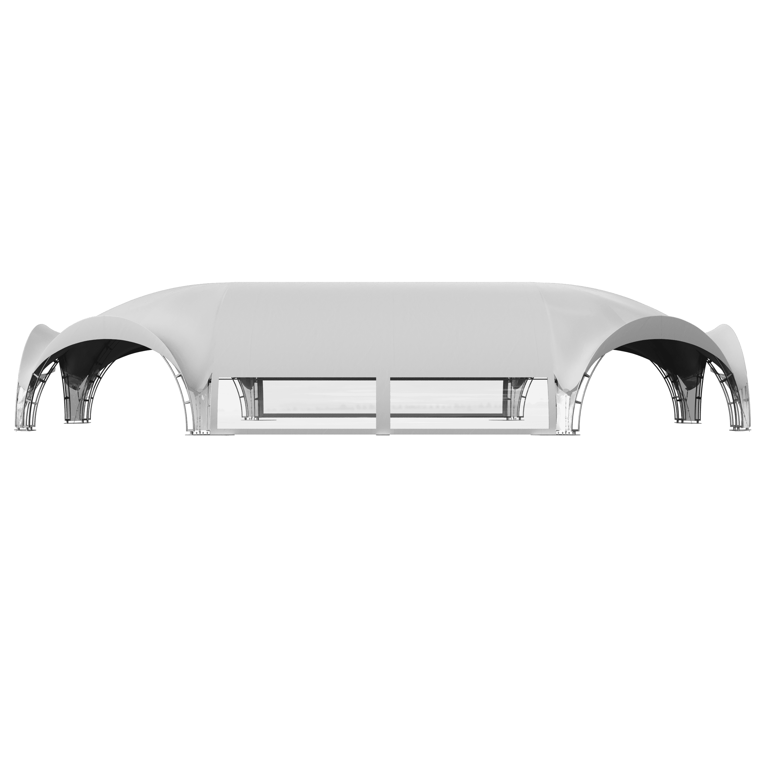 Конструкция TF arka Hexagon 27×20 имеет площадь 460м2. Форма шатра в основании – шестиугольник. Вместимость до 230 человек (банкетной рассадки).
