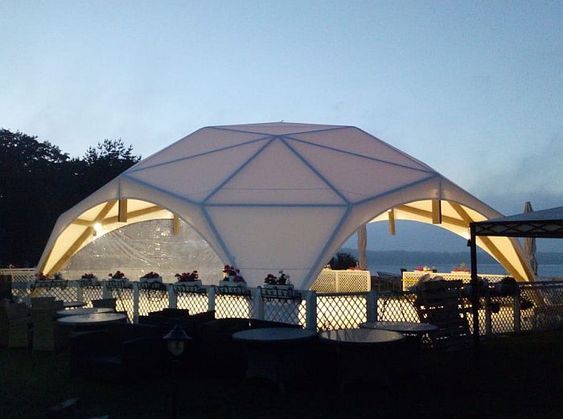 Каркас данного шатра состоит из клееного бруса, стальных коннекторов и лап. Конструкция разборная.