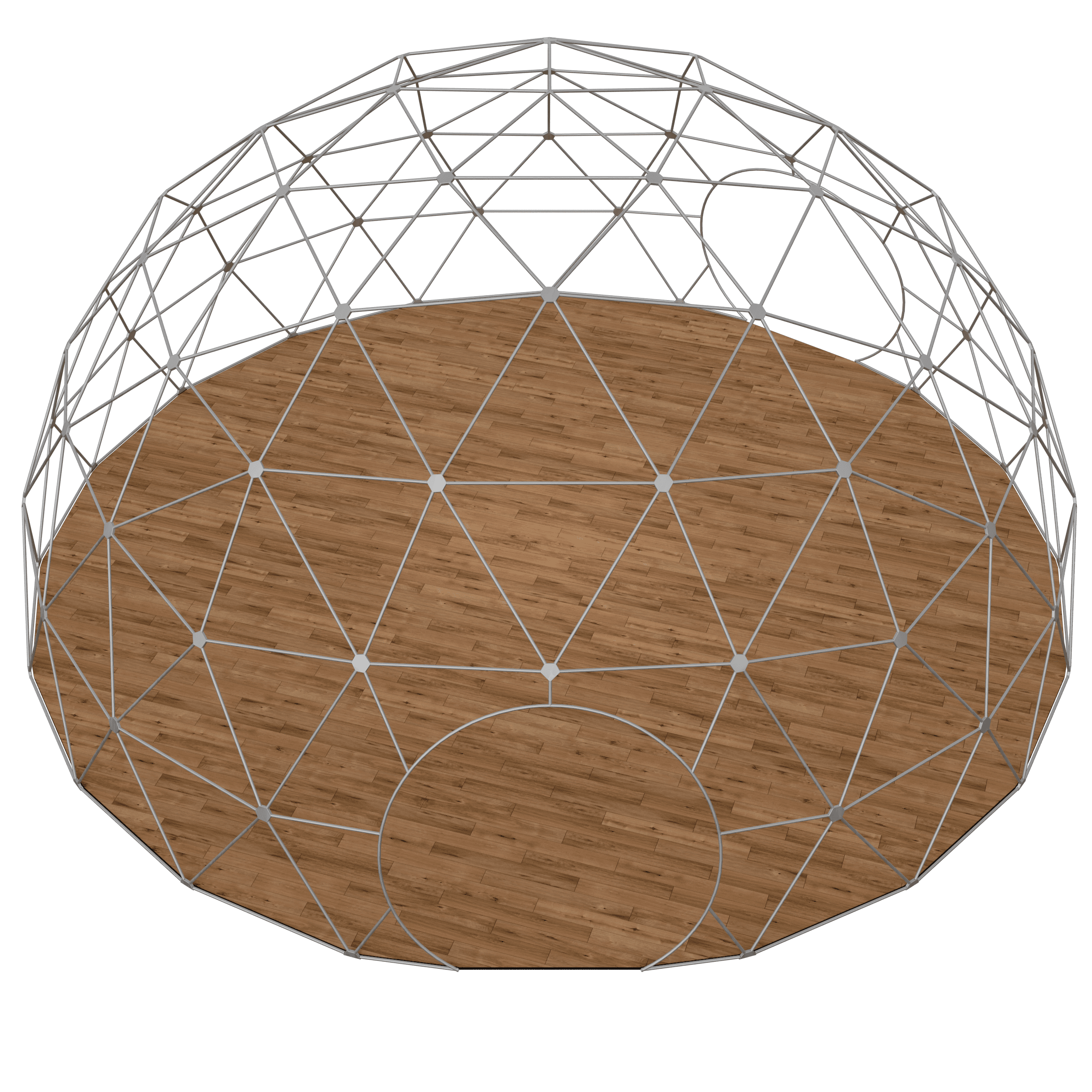 Данный шатер имеет форму полушара. Состоит из металлических стержней, коннекторов, лап. Включает в себя, заранее запланированную заказчиком, входную группу их ПВХ либо алюминия.