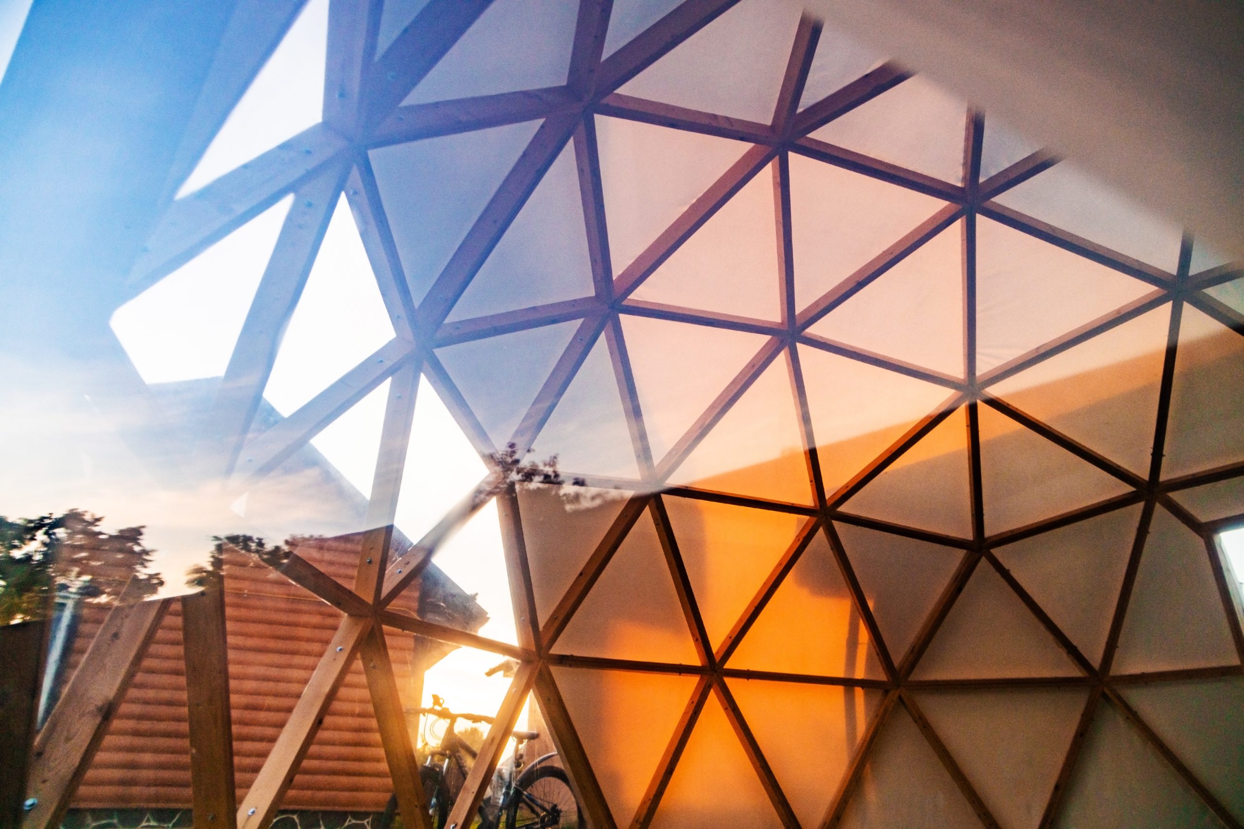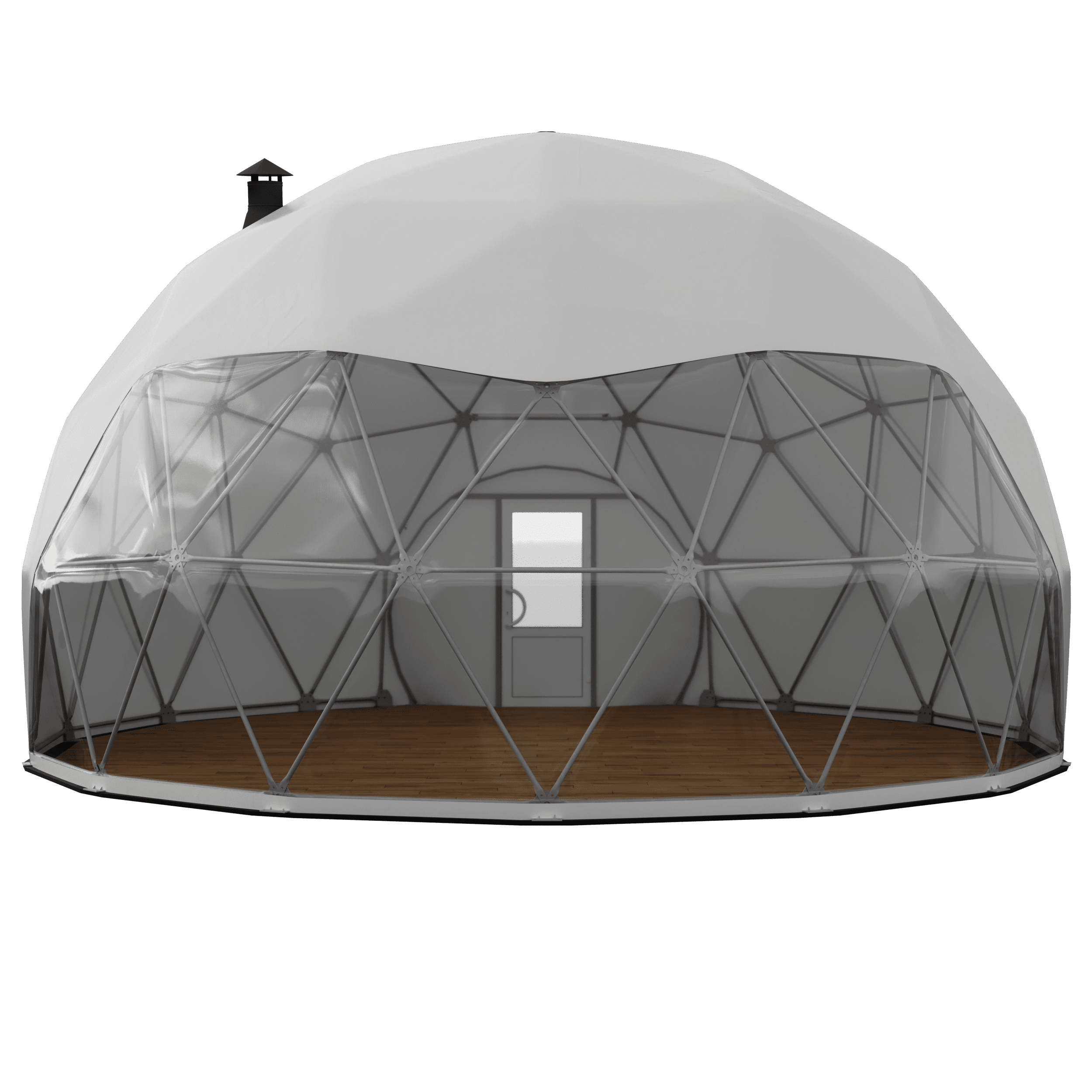 Данный шатер-глэмпинг имеет форму полушара. Состоит из металлических стержней, коннекторов, лап. Шатер включает в себя, заранее запланированную заказчиком, входную группу их ПВХ либо алюминия. Каркас устанавливается на предварительно установленное основание, либо бетонное покрытие, при помощи специальных креплений.